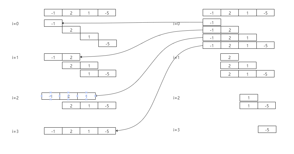 • 每一次的结果是基于上一次的最大值比较的,从长度等于1开始,所以取中最大的就是子数组中的最大的原因就在于此,因为上一次的结果就是最优解(最大值),所以本次只需要比较一次就可以了