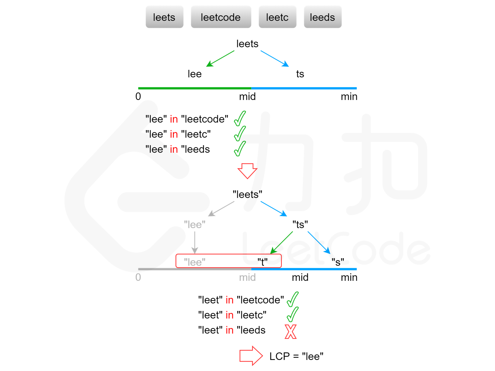 显然,最长公共前缀的长度不会超过字符串数组中的最短字符串的长度。用 minLength 表示字符串数组中的最短字符串的长度,则可以在 [0,minLength] 的范围内通过二分查找得到最长公共前缀的长度。每次取查找范围的中间值 mid,判断每个字符串的长度为 mid 的前缀是否相同,如果相同则最长公共前缀的长度一定大于或等于 mid,如果不相同则最长公共前缀的长度一定小于 mid,通过上述方式将查找范围缩小一半,直到得到最长公共前缀的长度。