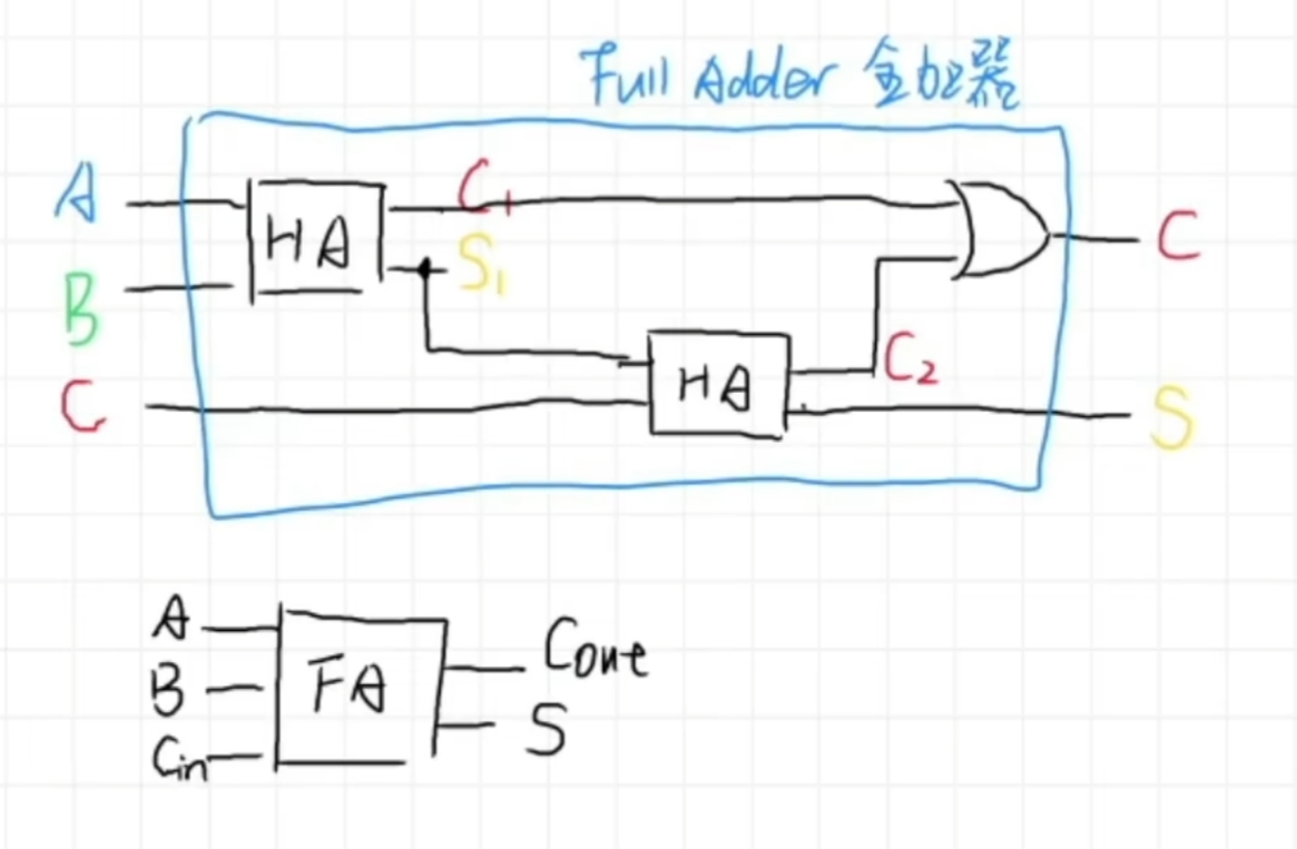 全加器:相比于半加器的两个输入外,多一个上一次进位的输入,因此用两个半加器可以实现一个全加器,最后通过一个或门,确认进位的输出。