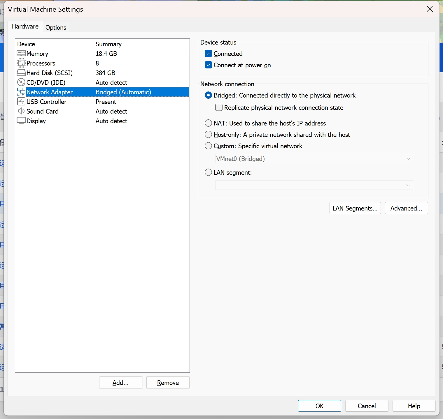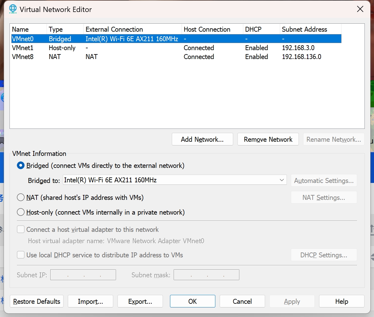 • VMware虚拟网络管理中,选择桥接模式并选择当前网卡