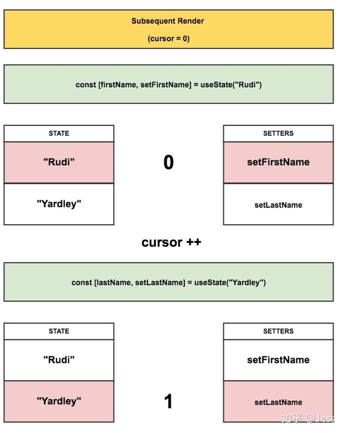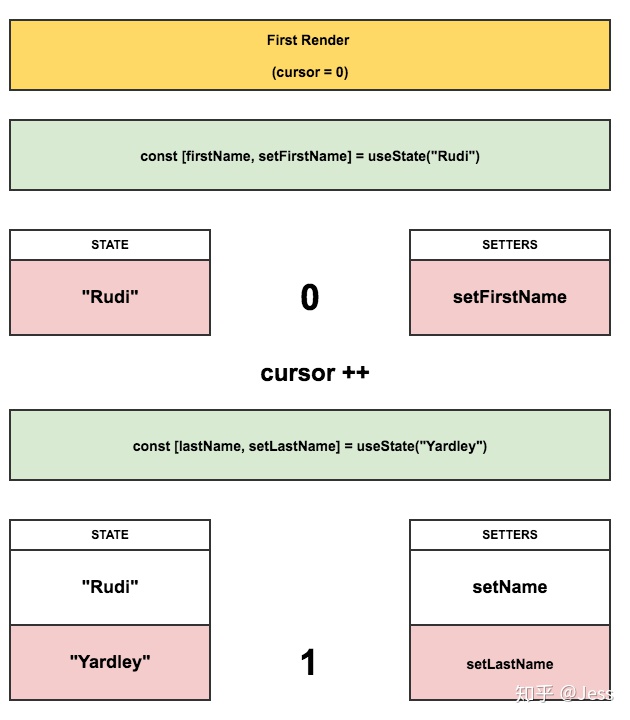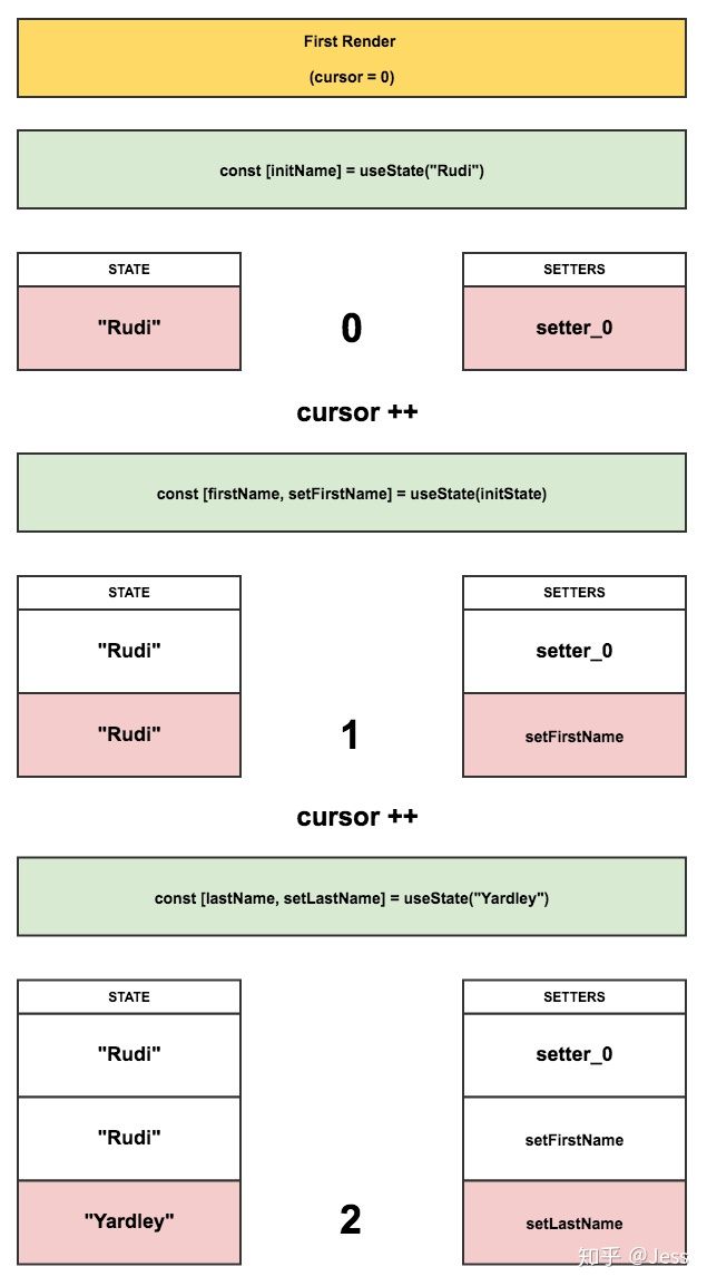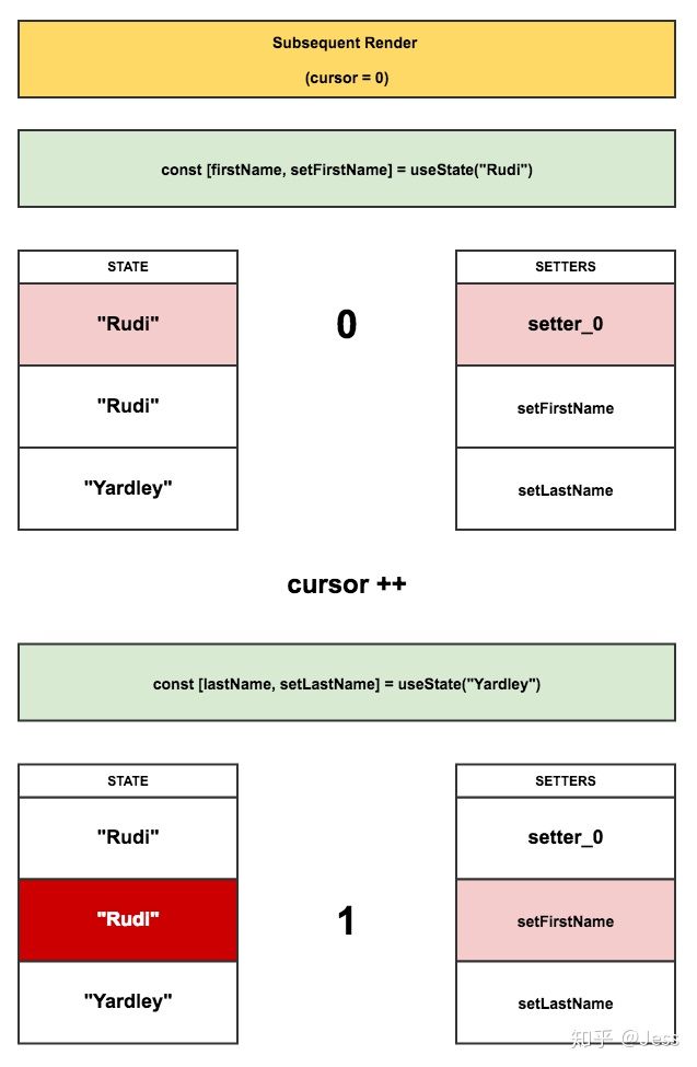 后续组件的每次render,指针都会重置为 0 ,每调用一次 useState,都会返回指针对应的两个数组里的 state 和 setter,然后将指针位置 +1。