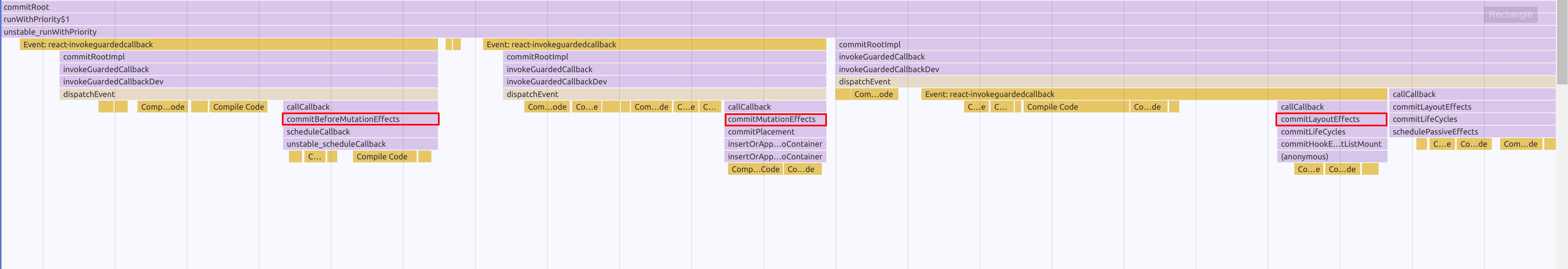 commitBeforeMutationEffects: 操作真实节点前执行,会执行getSnapshotBeforeUpdate