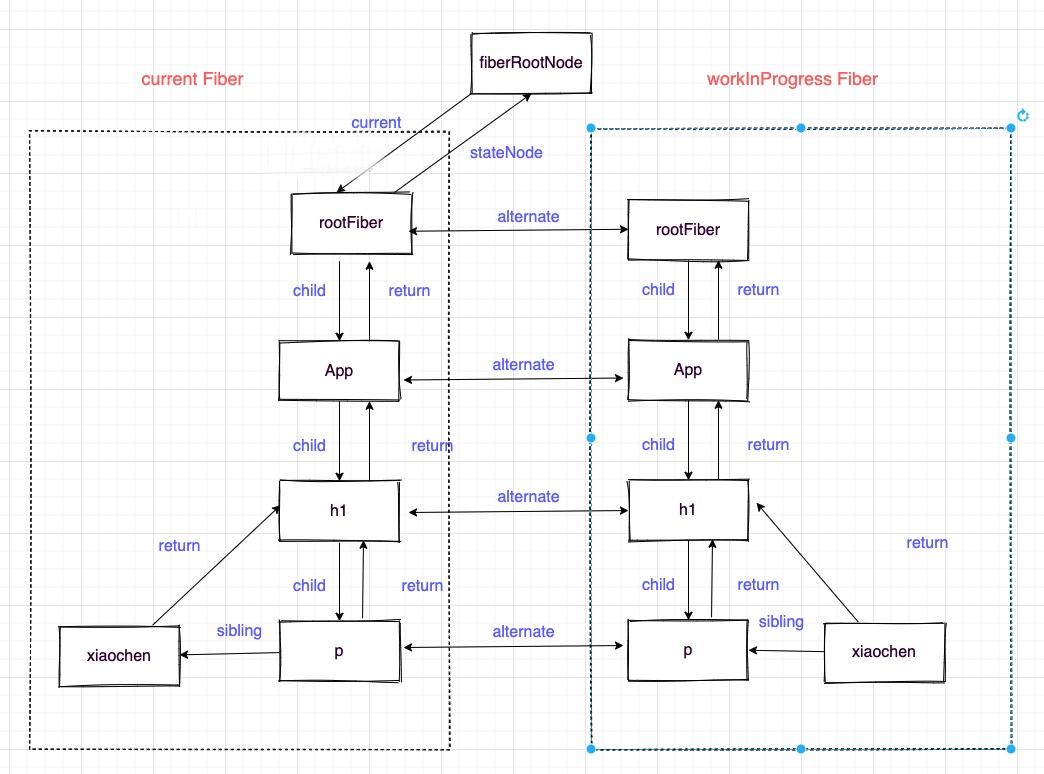 双缓存是指存在两颗 Fiber 树,current Fiber 树描述了当前呈现的 dom 树,workInProgress Fiber 是正在更新的 Fiber 树,这两颗 Fiber 树都是在内存中运行的,在 workInProgress Fiber 构建完成之后会将它作为 current Fiber 应用到 dom 上