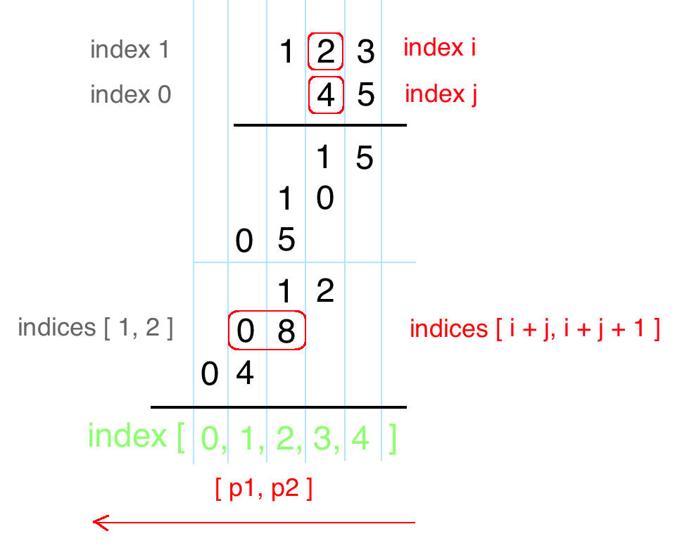 • num1[i] * num2[j] 的结果为 tmp(位数为两位,”0x”,”xy”的形式),其第一位位于 res[i+j],第二位位于 res[i+j+1]