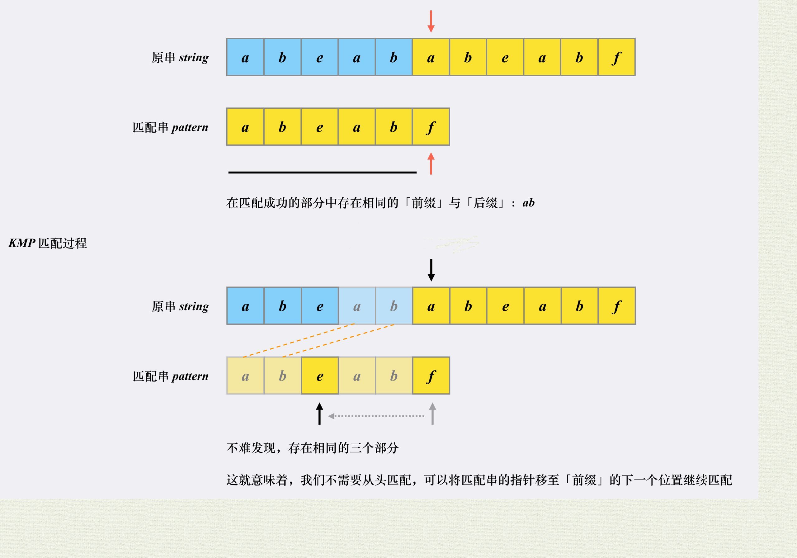 kmp 算法的关键点在于,当匹配串(pattern)下一个字符不再匹配的时候,不会盲目的移动到原串的下一位继续从头判断,而是利用已知信息跳到一个合理的位置继续匹配。