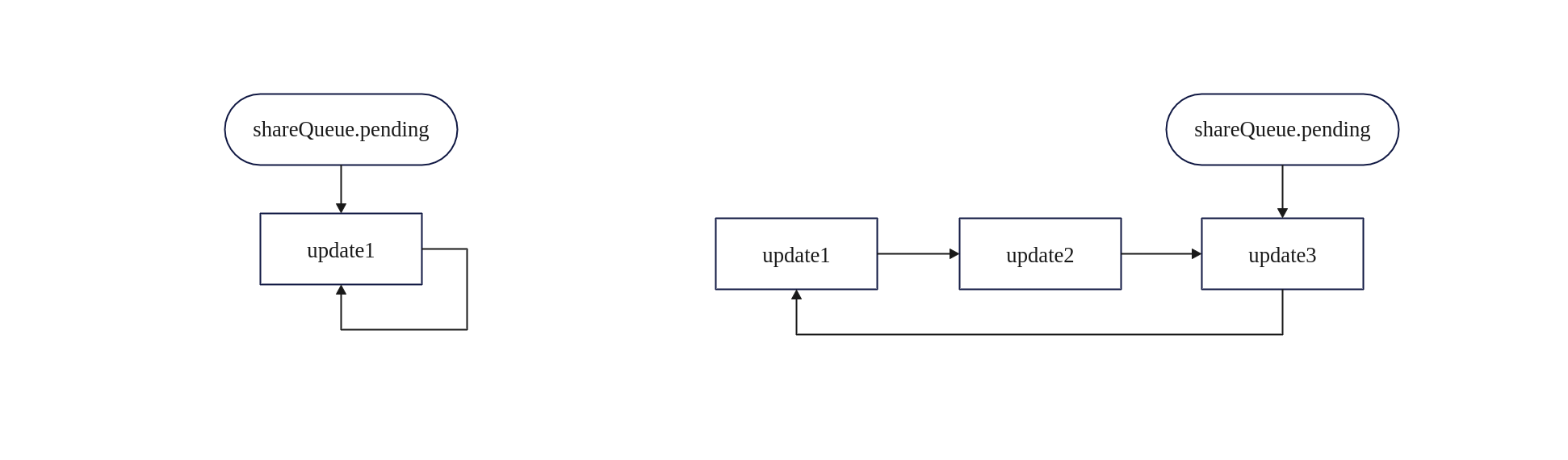 一轮跟新后如果有两个低优先级更新没有处理,那么这两个更新会放在 baseState 上,如果有另外两个更新进来会放在 shared.pending 上并且形成一个环状链表,下一次 commit 时 shared.pending 会被拼接到 baseState 后面,循环处理哪些符合优先级的更新,基于符合条件的更新,来计算最终的state.