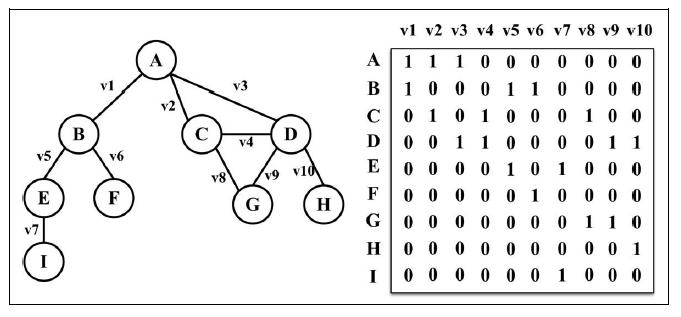 关联矩阵中,矩阵的行表示顶点,列表示边。如下图所示,