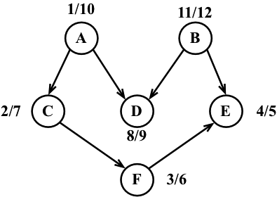 depthFirstSearch(vertices[0], adjList, color, find, visit, back, time);