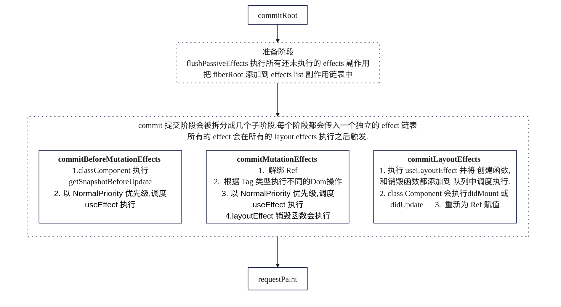 在上面三个阶段执行結束后,会执行请求绘制的方法, 通过 Scheduler 模块调度, 这也是 useLayoutEffect 会在 DOM 绘制前执行的原因