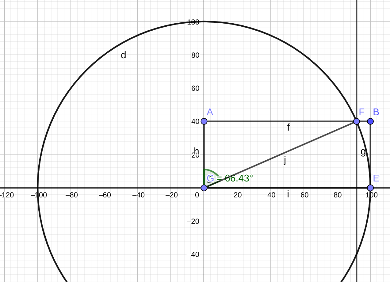 想求的是 AGF 的角度, 那么只要求出 FGE 就可以了, sinFGE = AG / FG 所以 FCE = srcsin(40/100)