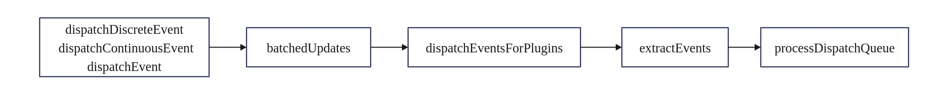 当一个事件触发时, 会调用事件绑定时创建的回调函数,这个函数会以批处理的形式调用事件处理方法 dispatchEventsForPlugins